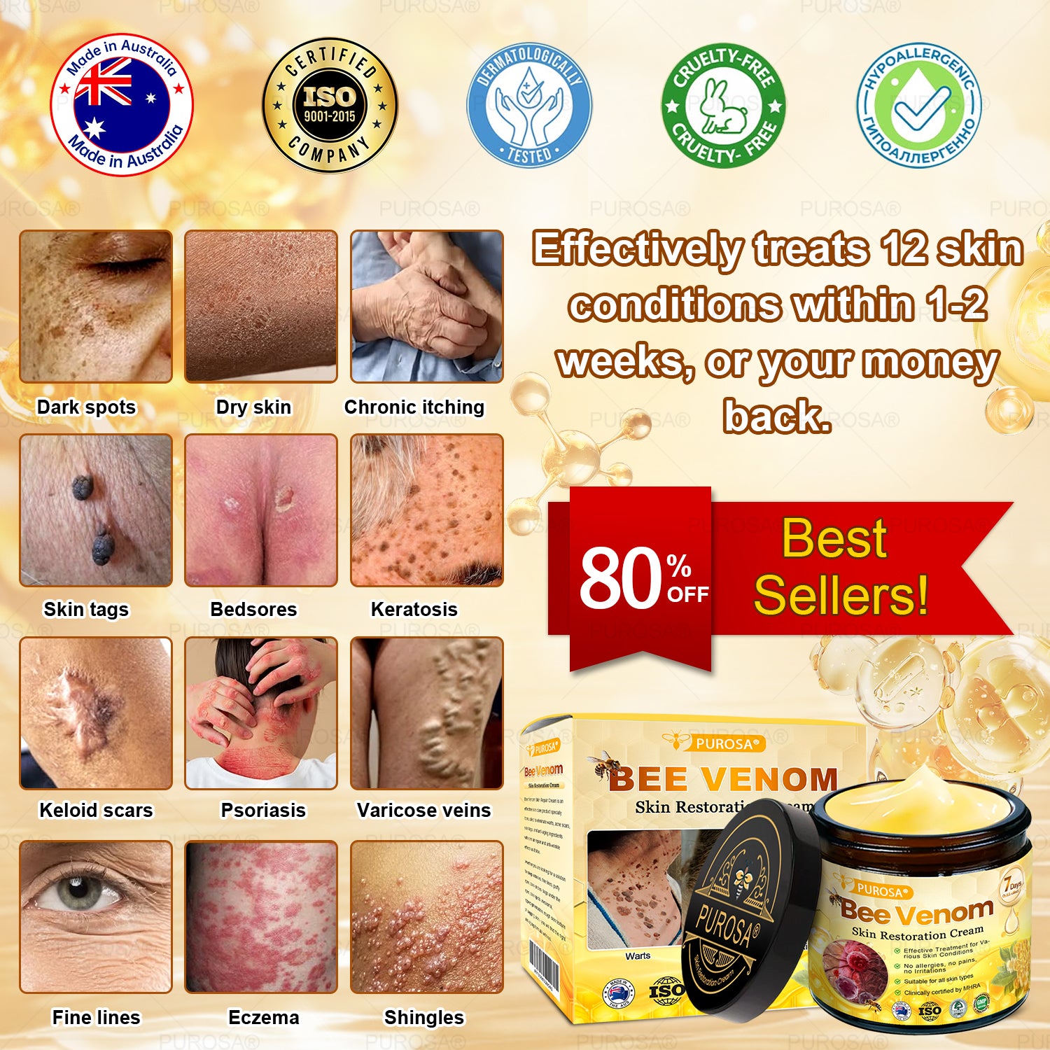 PUROSA® Bee Venom Skin Treatment Cream, Anti-aging, Hydrating, Skin Repair, Even Tone, Acne and Dark Spot Treatment, Wart and Mole Removal, Psoriasis Relief
